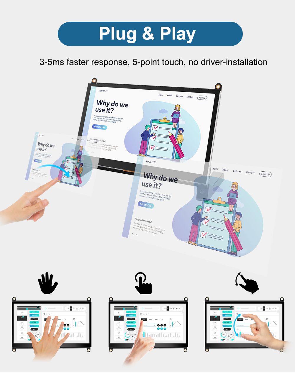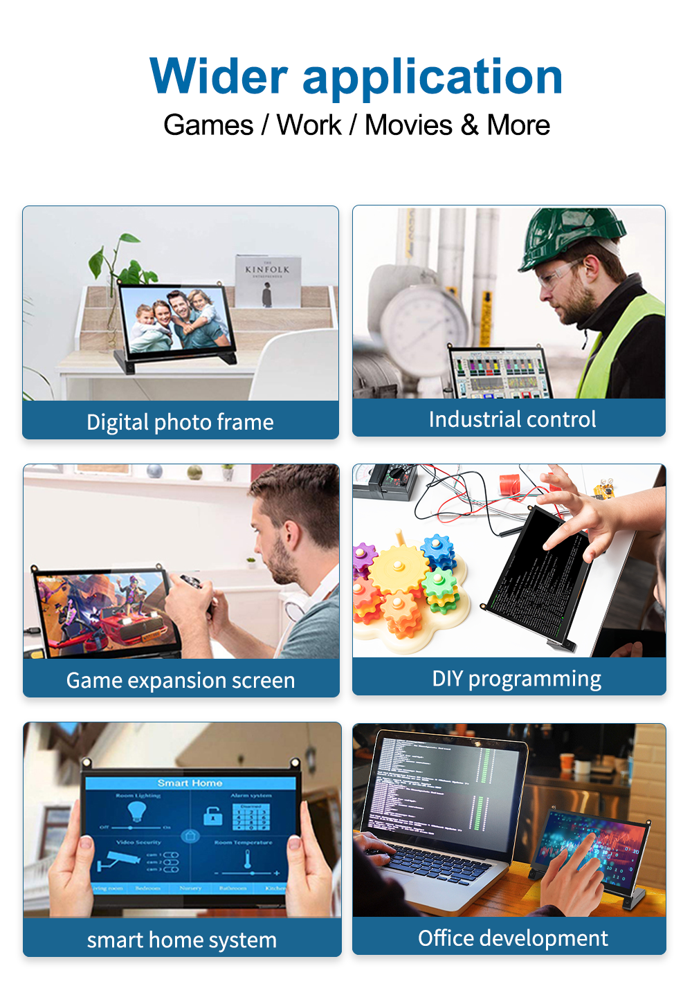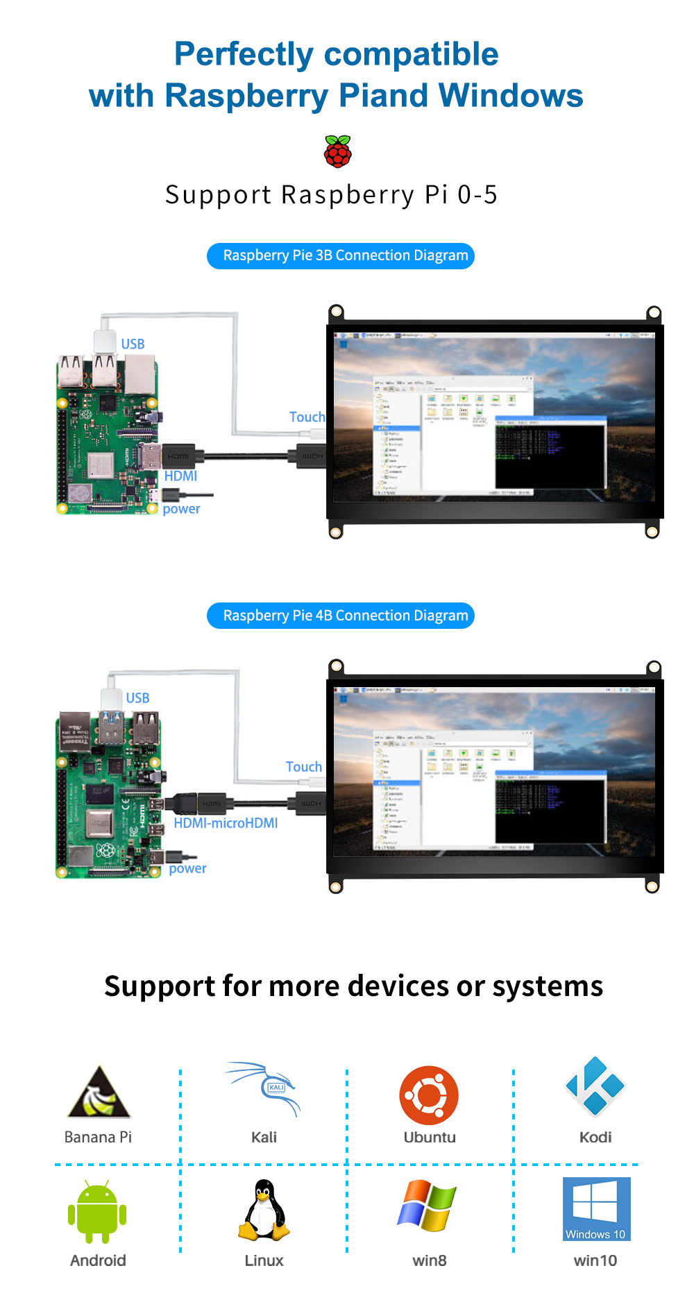 With this USB monitor, you can start your project without downloading and installing any drivers. You can use it with Raspberry Pi 5/4/3/2/1/B+, Banana Pi. This monitor is suitable for Windows 7/8/10 PC, Mac, Microsoft, media player, Fire TV stick and Apple TV, video game console, such as Nintendo Switch/XBOX/PS4. It also supports other devices or systems, such as Retro Pi, NOOBS, Debian, Ubuntu, and Kodi.