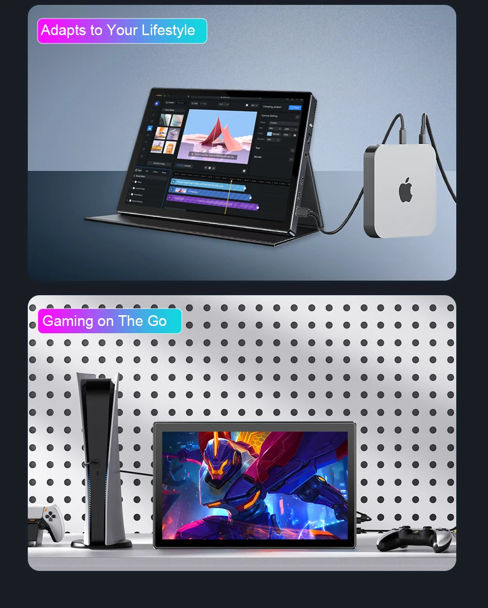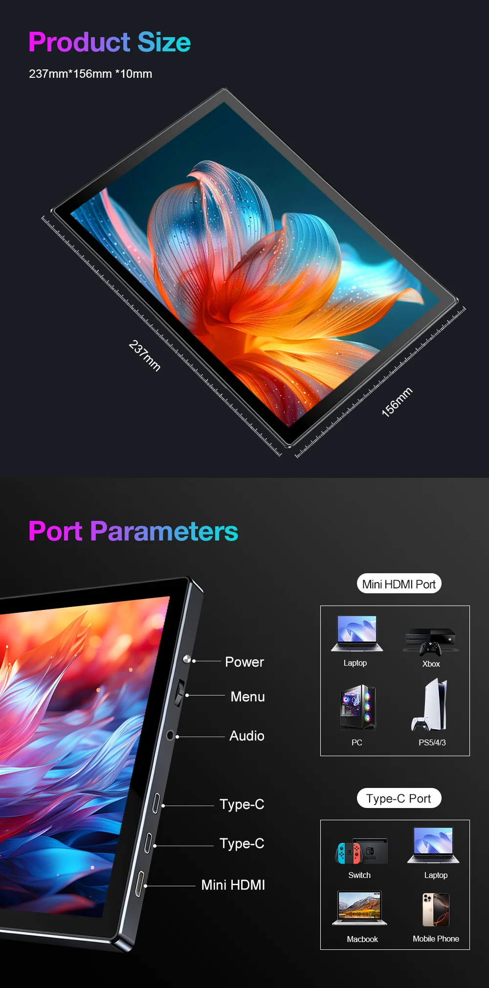 Howens 10.1 inch 1920x1200 portable Monitor, Support Typc-c/HDMI,Leather Case VESA 75*75mm, for Mobile Phone Laptops PC Car Computer